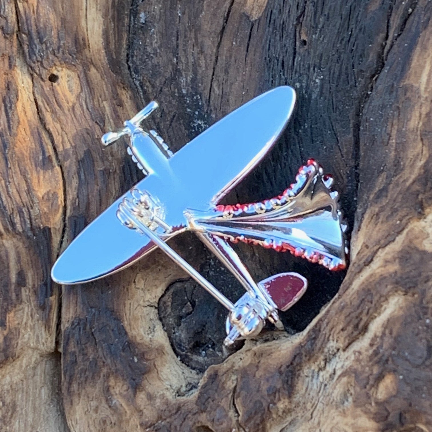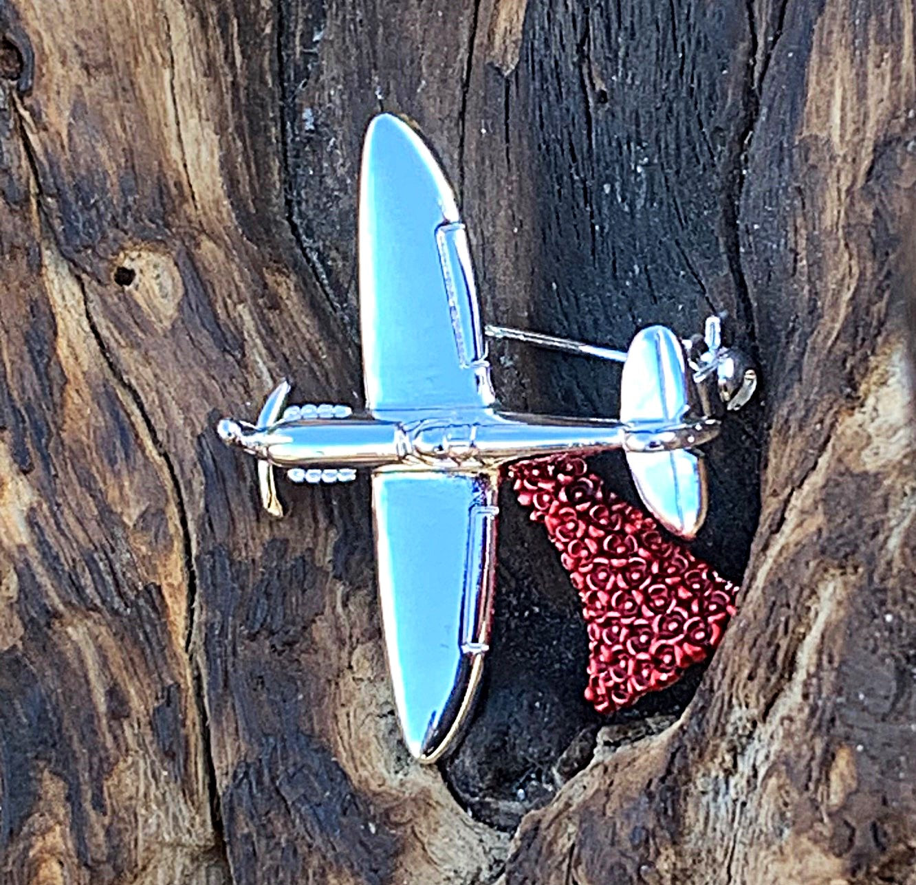 Silver and red poppy enamelled brooch featuring the iconic Spitfire Aircraft with cascading red poppies, a touching tribute to the service men and women who flew in these incredible aircraft. Fastening consists of a brooch pin with safety clasp.